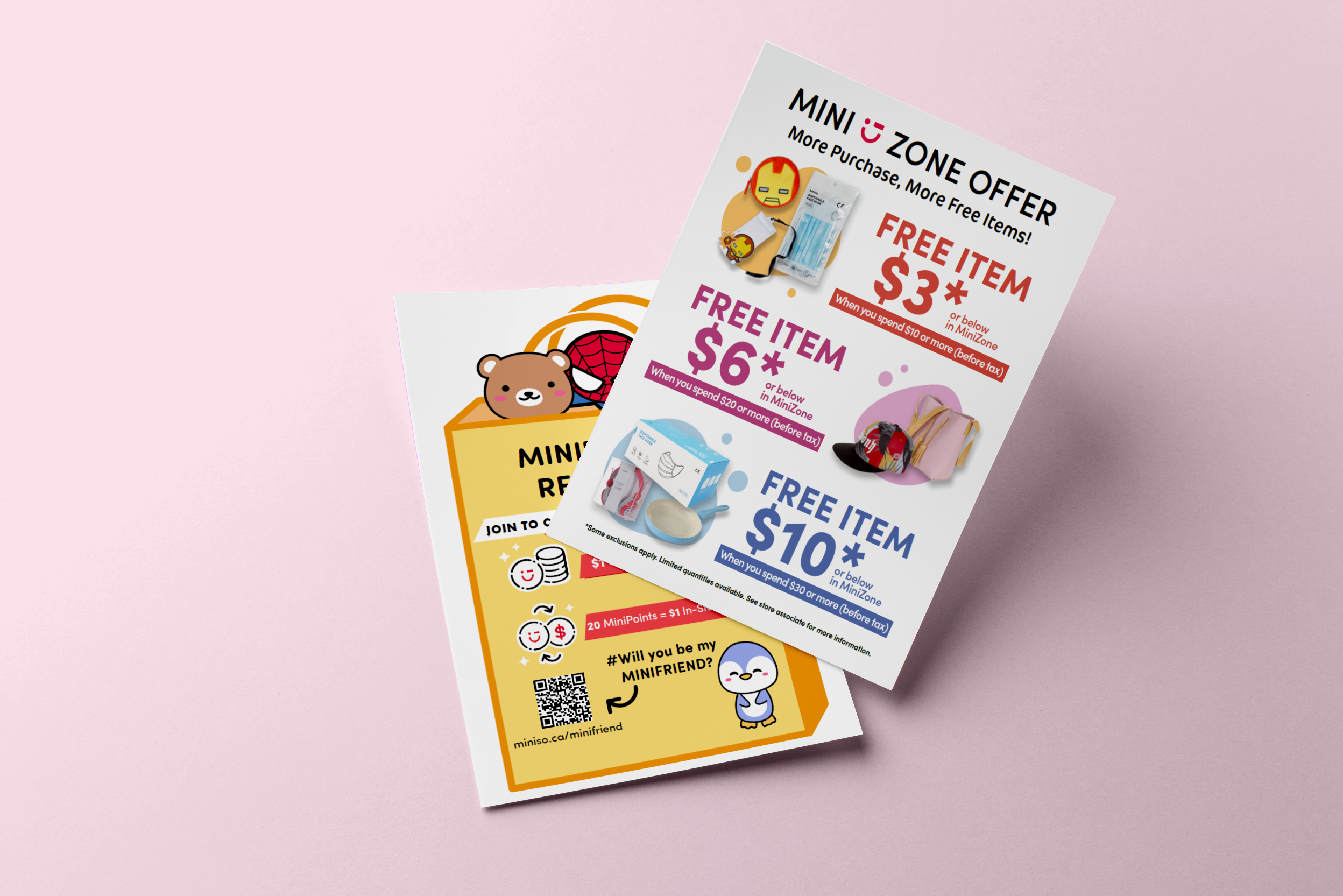 Miniso is a Japanese-inspired lifestyle product retailer. Inspired by minimalism and cute Asian styles, I assisted the marketing team with designing emails, social media posts, website graphics, print materials, product photo retouching and animating motion graphic videos. I kept a kawaii style throughout the graphics like flowy shapes, soft colour palettes and bubbly design elements. It was important to Miniso that I was able to showcase promotional deals and sales in a cute, engaging design.